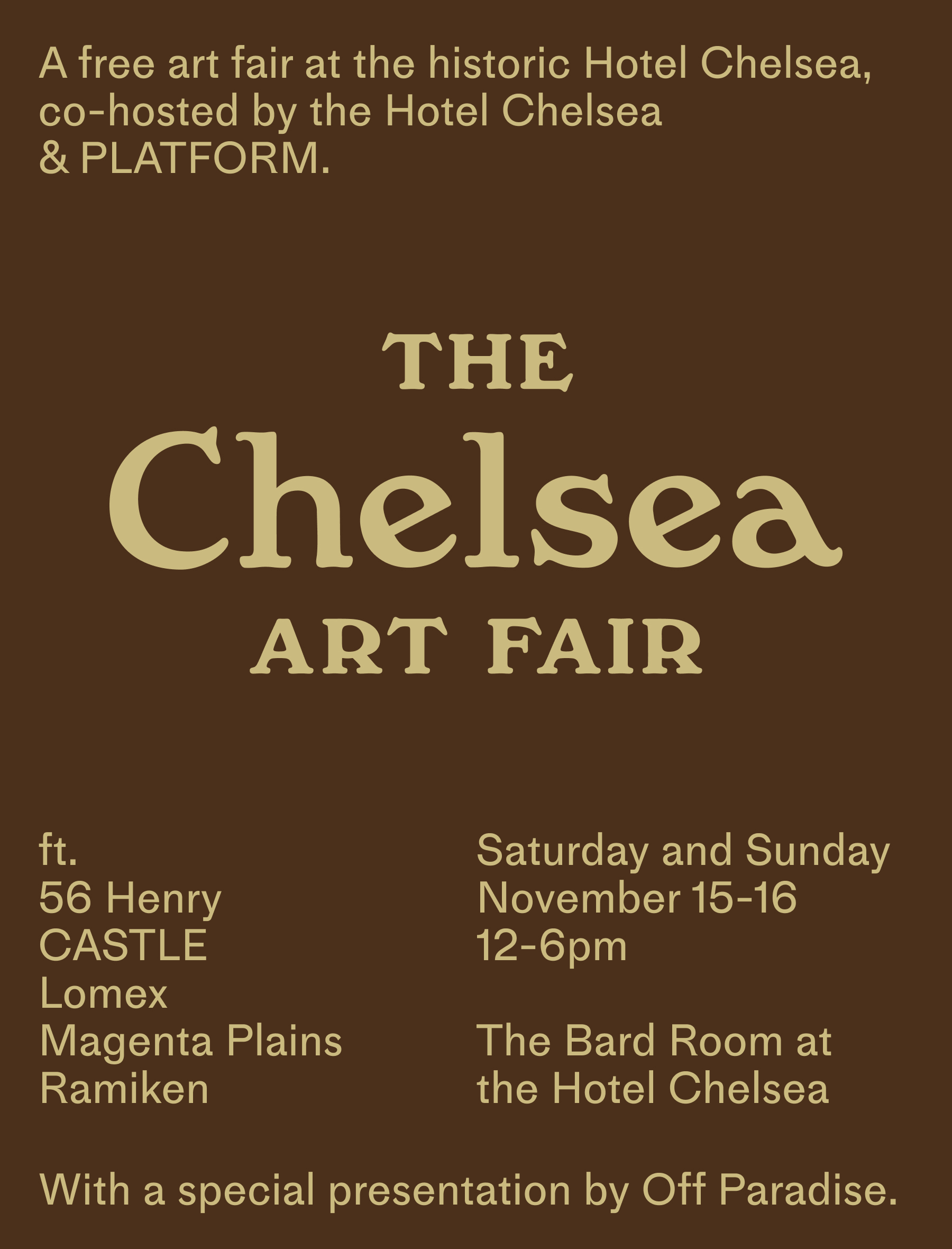 Off Paradise is delighted to announce its participation in the second edition of the Chelsea Art Fair opening November 15–16 at the Hotel Chelsea, co-hosted by PLATFORM: and the Hotel Chelsea.